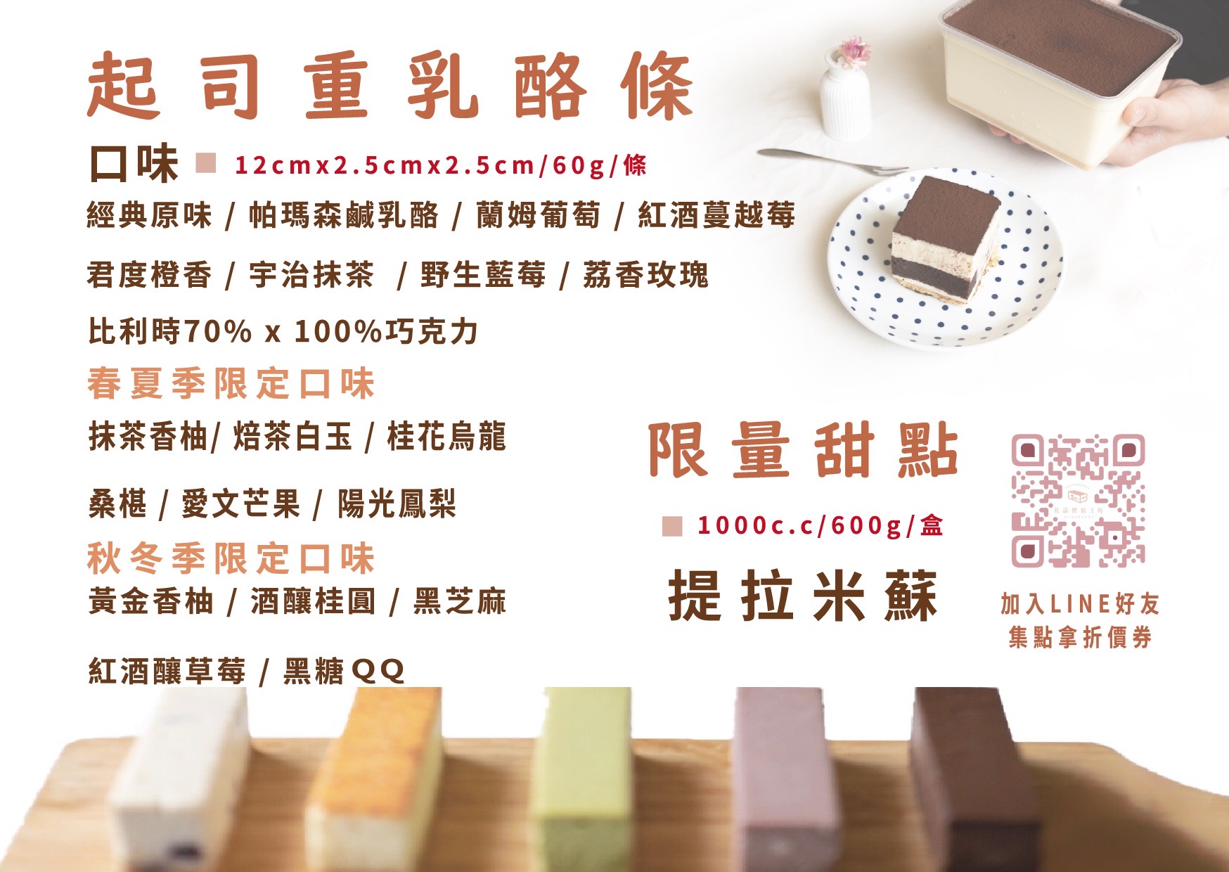 我們用心於選擇優質的食材,單純地將天然新鮮乳酪加上少許無鹽奶油、新鮮農場雞蛋和日本海藻糖及天然水果乾等食材交織出幸福的美味。慢慢地,客人發現了我們的起司條好吃又實在,也發現我們沒有嘩眾取寵的名稱及包裝。